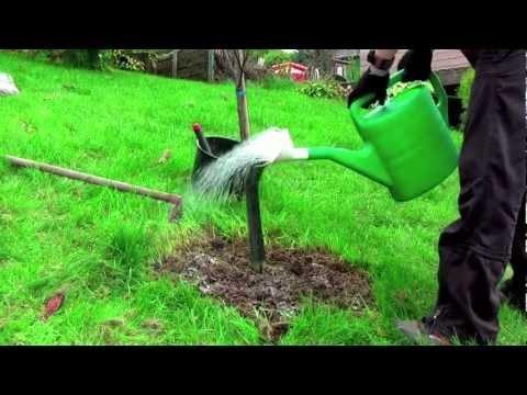 Непосредственно перед посадкой, яма присыпается верхним плодородным слоем. Затем, саженец помещается в центр углубления корневой шейкой на юг и засыпается оставшейся землей. Почву следует утоптать и сформировать у приствольного круга небольшой холмик. Рядом с деревцем вбивается колышек, к которому оно привязывается. Далее, вокруг холмика нужно выкопать ров и залить в него воду. Следует помнить, что особенно важно поливать яблоню в первый год жизни, как минимум, два раза в месяц.