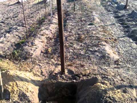 Проволоку на столбах нужно закрепить с помощью гвоздей, скоб и металлических колец, чтобы она не съезжала. Кусты растения высаживают на глубину 80 см, из них формируют от 2 до 6 рукавов, приучая лозу расти параллельно земли, а молодые побеги сами цепляются усиками за ряды проволоки и уже подвязывать их нет необходимости.