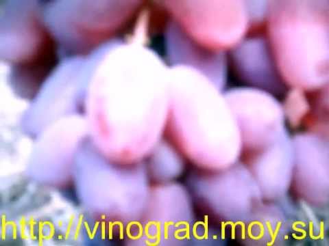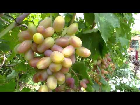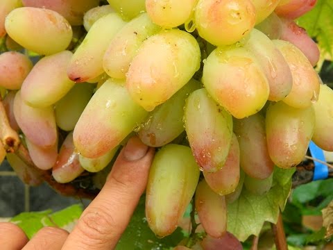 Описание грозди: гроздь имеет форму конуса, зауженного снизу. Вес варьируется от 0,6 до 1,1 кг. Если в период бурного цветения делать плановую обрезку, то можно не только увеличить размеры грозди, но и увеличить урожайность. Созревают ягоды на всей грозди одинаково.- Описание ягод: характеристика ягод заключается в очень больших размерах, их длина может достигать 4 см, в отдельных случаях ягода бывает 6 см. Масса виноградинок 16-18 гр. Форма ягод овальная с заостренным кончиком.