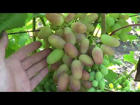 Вес одной грозди может достигать килограмма или двух. Форма ягод – продолговатая, пальцевидная, с розовым или желтым окрасом. На вкус плоды сочные, сладкие, с чуть мускатным послевкусием. На плодах нет трещин, а при раскусывании они хрустят. Кожица тонкая, почти не ощутимая. Размер листьев средний, они слегка округлые, по форме напоминают сердце. При созревании отсутствуют признаки измельчения ягод или их горошение.